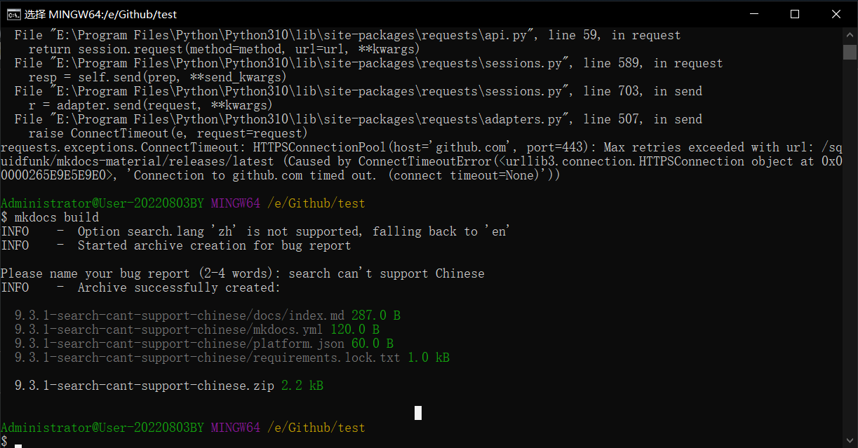最后再 mkdocs build 一次,但是这次需要能连接上 github (要挂梯子),然后会在项目根目录生成一个 zip 文件