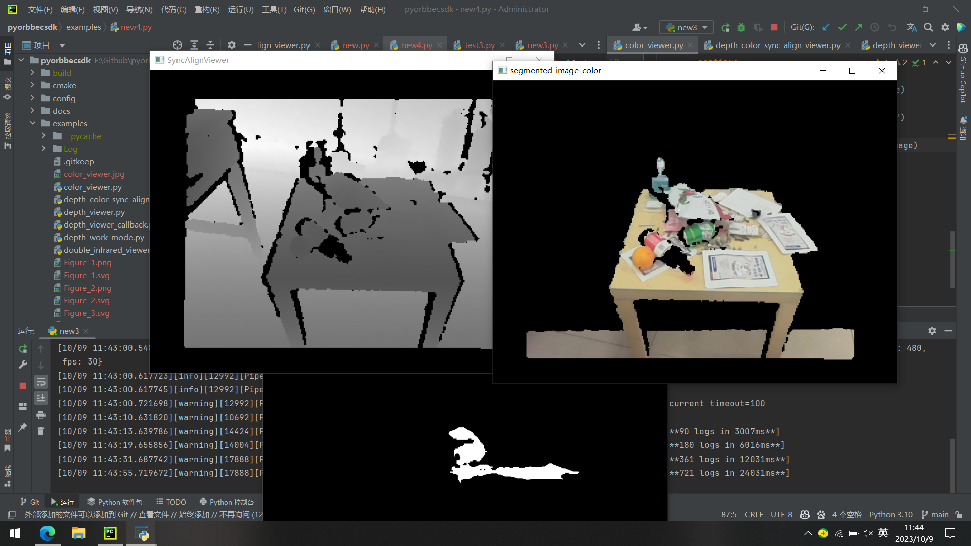 但运行 pyorbbecsdk\examples\depth_color_sync_align_viewer.py 能获取出深度帧和彩色帧结合在一起的图像,所以我根据这个文件的代码,获取到了对应了位置的深度帧和帧的图像,然后进行了分割算法的测试