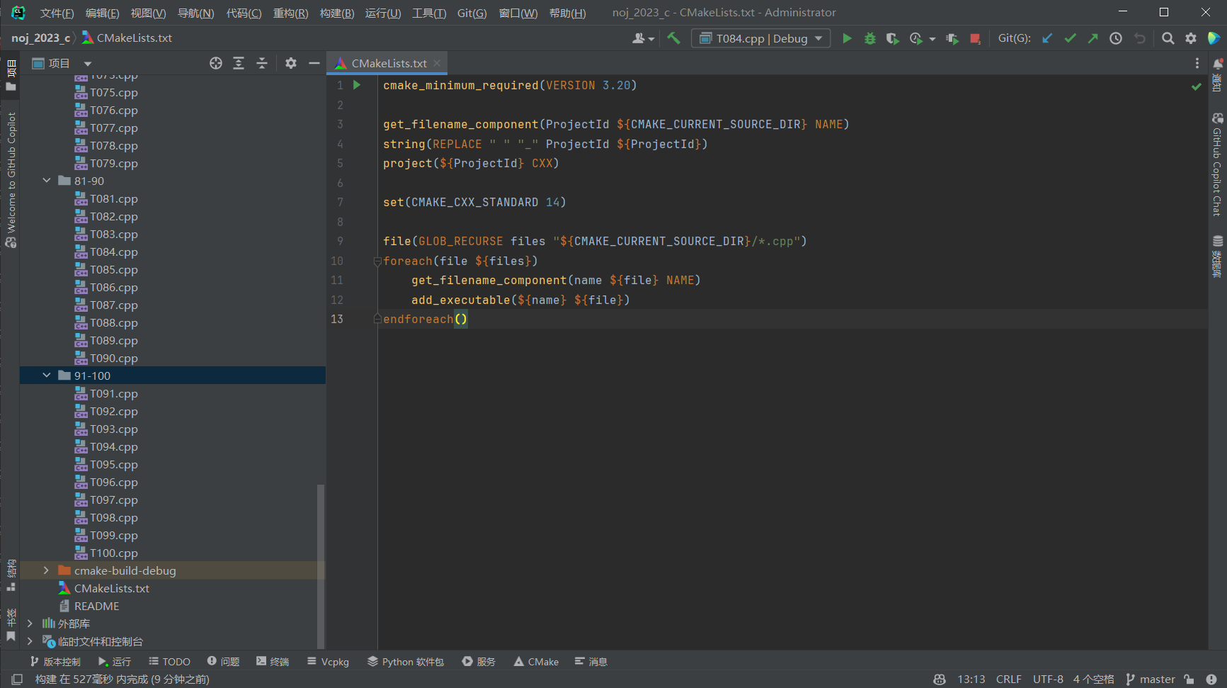 于是拿这个代码向 chatgpt 询问了一下 You: help me explain this ChatGPT: Certainly! The provided code is a CMakeLists.txt file, which is used to configure and build C++ projects with CMake, a cross-platform build system. Let's break down the code section by section: In summary, this CMakeLists.txt file sets up a C++ project, replaces spaces in the project name, sets the C++ standard, and creates an executable for each .cpp file in the project directory and its subdirectories. The project name is derived from the name of the directory containing the CMakeLists.txt file. You: translate to chinese ChatGPT: 当然!提供的代码是一个CMakeLists.txt文件,用于使用CMake配置和构建C++项目,CMake是一个跨平台的构建系统。让我们逐个部分解释代码: 总的来说,这个CMakeLists.txt文件设置了一个C++项目,替换了项目名称中的空格,设置了C++标准,并为项目目录及其子目录中的每个.cpp文件创建一个可执行文件。项目名称来源于包含CMakeLists.txt文件的目录的名称。chatlog