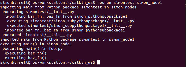Why bother with this extra layer of files if the real work is being done elsewhere? The ROS command rosrun hooks into nodes and scripts, as does roslaunch. But we may also want to import our ROS package functionality into a second ROS package. This is done by declaring Catkin dependencies in the second ROS package (for building purposes) and then using standard Python mechanisms for importing the code from the first package into the second one. The “Python mechanisms” bit is important, as it means we should structure our importable code as a Python package, not to be confused with a ROS package!