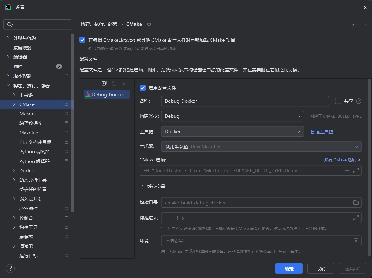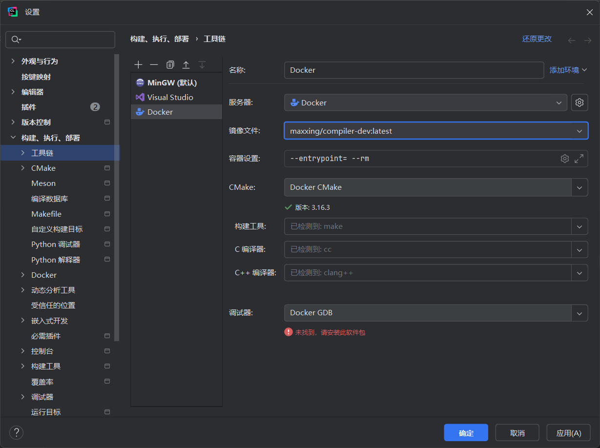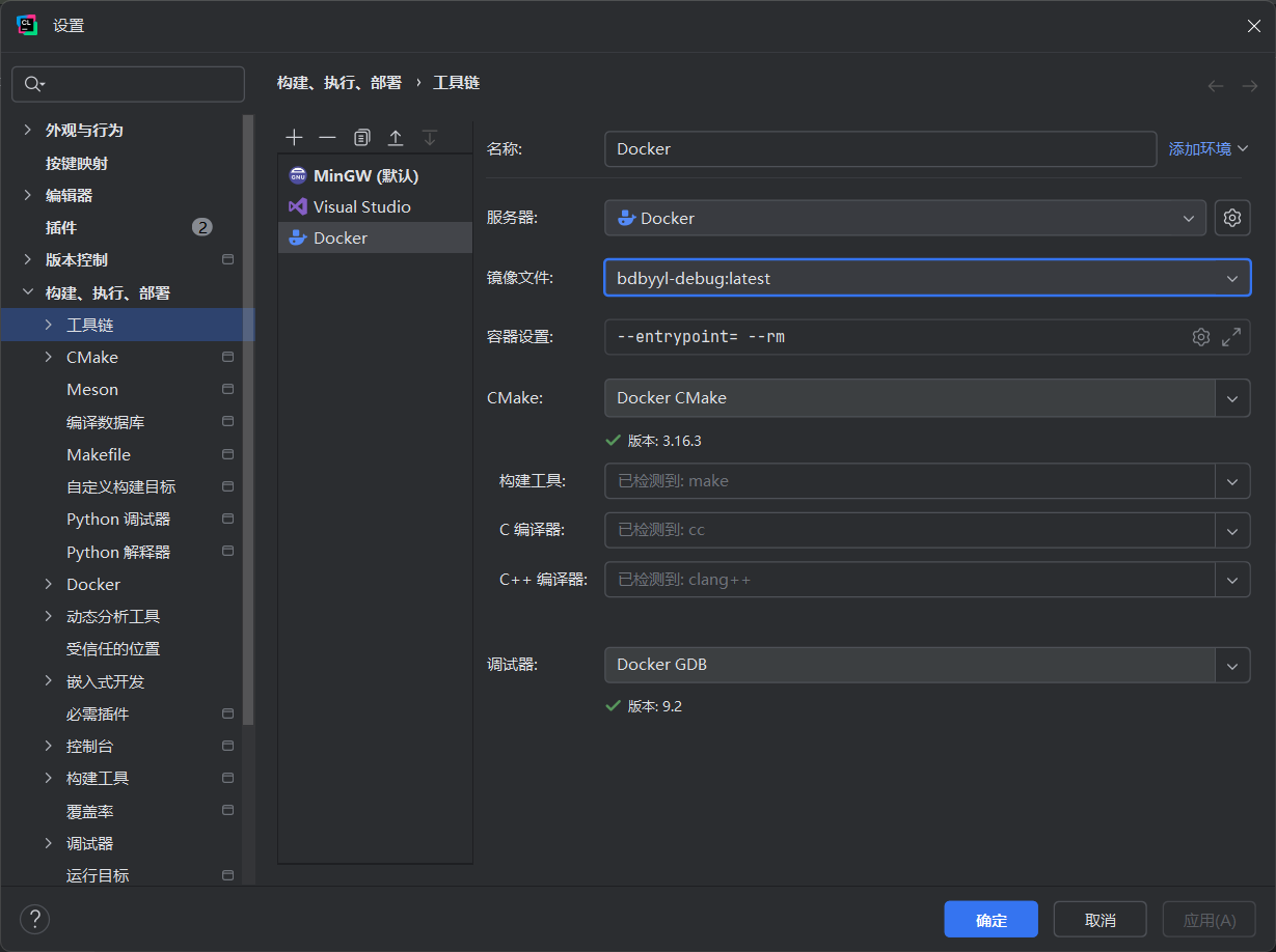 然后按照Build, run, debug with a Docker toolchain中的说明,在cmake中把工具链改成docker