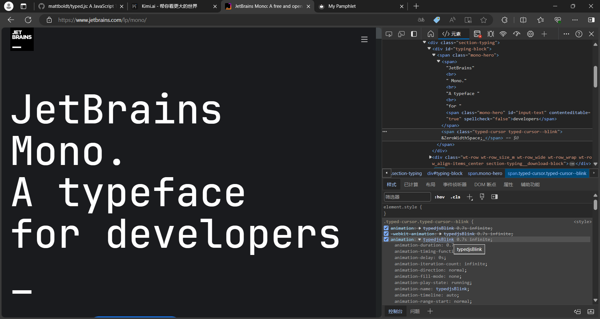 由于在JetBrains Mono字体网页上看到了打字的动画效果,然后想将这个效果应用到手册首页的介绍文字上,于是开始进行尝试。